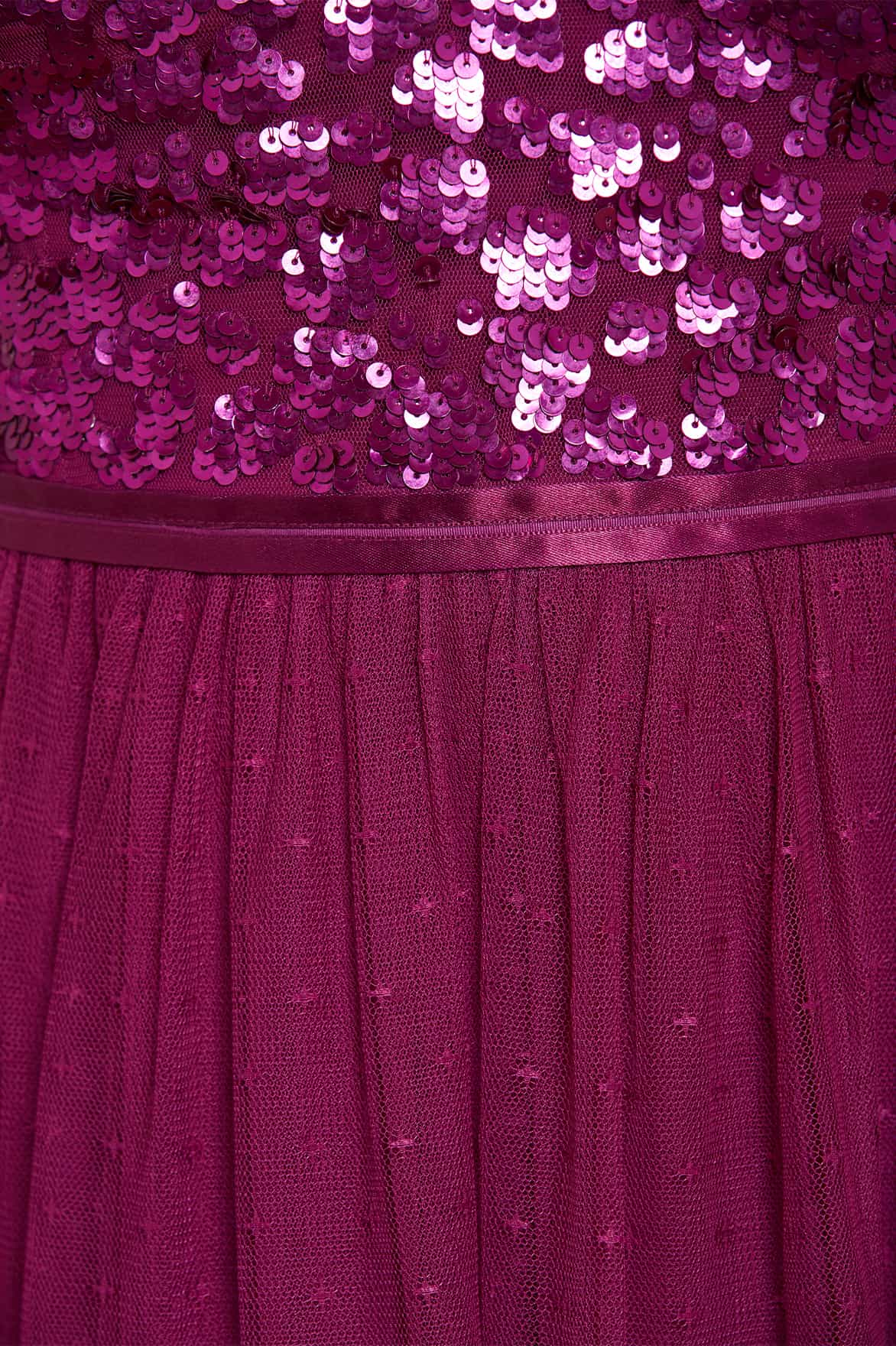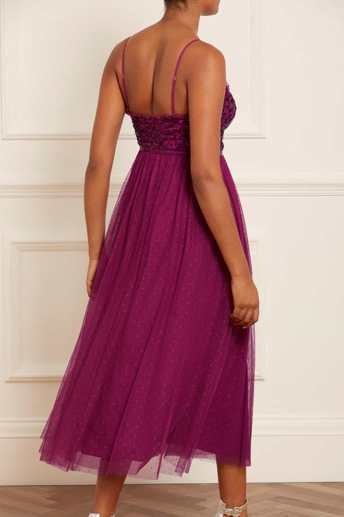 The Tempest Bodice Cami Ballerina Dress in Plum. This ballerina length dress is inspired by a vintage lace tablecloth design, embellished with shimmering sequins all over the bodice. Designed with cami sleeves, a layered tulle skirt with an 'x' motif and frill trim detailing around the neck. Make an entrance in the Tempest.