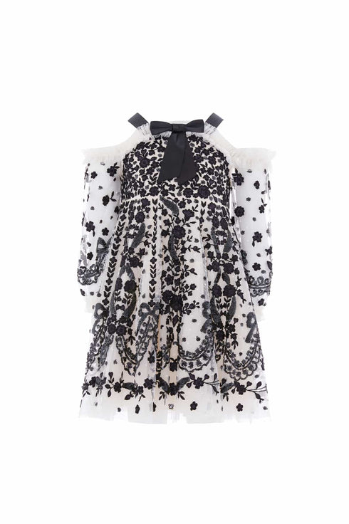 The Adeline Off-Shoulder Kids Dress in Cream/Graphite. Inspired by delicate Victorian lace, this dress is adorned with floral embroidery and shimmering sequin highlights. Designed with off-shoulder sleeves adding a soft, romantic touch. A charming mini version of the women’s gown, style with the matching Adeline Gown for a special mummy-and-me moment.