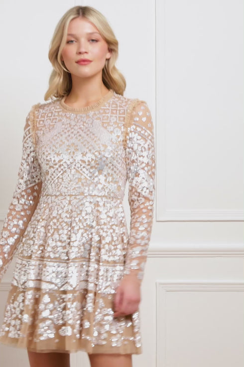 The Aurora Mini Dress in Butterscotch/Cream. A signature Needle & Thread style from the archive, this timeless dress draws inspiration from antique tablecloths of the early 1900s. Intricately crafted with a shimmering placement border of sequins, it celebrates the art of vintage craftsmanship. The elegant silhouette features a round neckline, slim long sleeves, and delicate tulle frills at the neckline and armholes—a hallmark of the brand. Finished with layers of soft, romantic tulle, this heritage piece captures classic beauty with a modern edge.