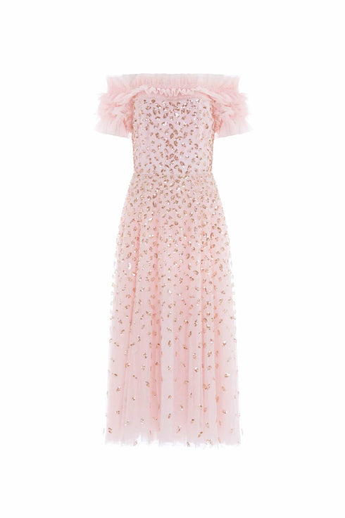The Autumn Leaves Off-Shoulder Ballerina Dress in Dusk Pink/Caramel. This ethereal piece is adorned with a glittering leaf motif that cascades gently towards the hem, capturing the essence of autumnal elegance. The dress features a romantic off-the-shoulder design complemented by tiered sleeves, each delicately edged with shimmering sequin embellishments. Crafted for comfort and style, the dress includes an internal corset made from stretch power mesh, ensuring a flawless fit while maintaining the garment's structure. The skirt is a true masterpiece, made up of layers of soft, delicate tulle and net, creating a generous and flowing silhouette that’s perfect for any special occasion.