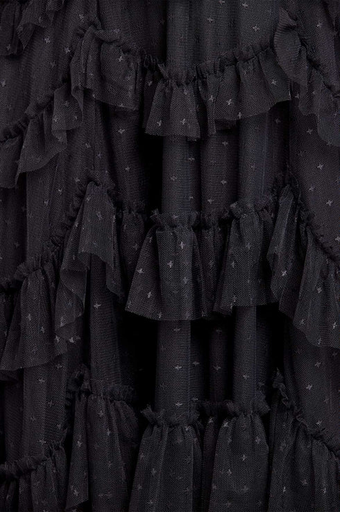 NEW SEASON. The Aviana Short Sleeve Gown in Graphite. Understated and elegant, this gown channels vintage eveningwear with a modern edge. Designed with soft rows of gathered tulle forming signature scallop textures, the graphite tone brings depth and quiet drama to the airy silhouette.