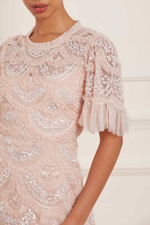 The Carmen Ruffle Ankle Gown in Petal Pink. Where romance meets elegance, the Needle & Thread Carmen Ruffle Ankle Gown is crafted from layers of soft tulle, adorned with exquisite embroidery, and sparkling iridescent sequins to create a beautiful silhouette. Each of the carefully crafted detail evokes the sense of timeless beauty. Layers of tulle give a soft shimmer to gentle ruffles in scalloped sections to create a signature Needle & Thread textured look.
