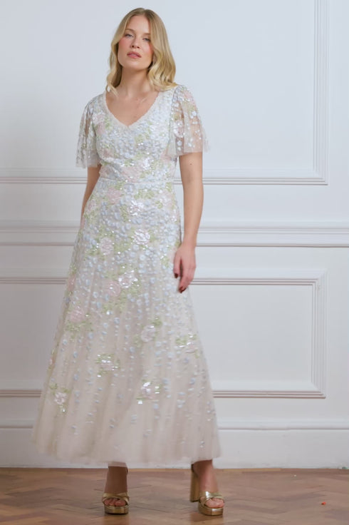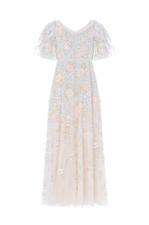 NEW SEASON. The Cressida Floral Short Sleeve Ankle Gown in Cream/Multi. A romantic ankle-length design embellished with intricate floral embroidery. Finished with short sleeves and a fluid tulle skirt, this gown radiates feminine elegance and Needle & Thread’s signature attention to detail.
