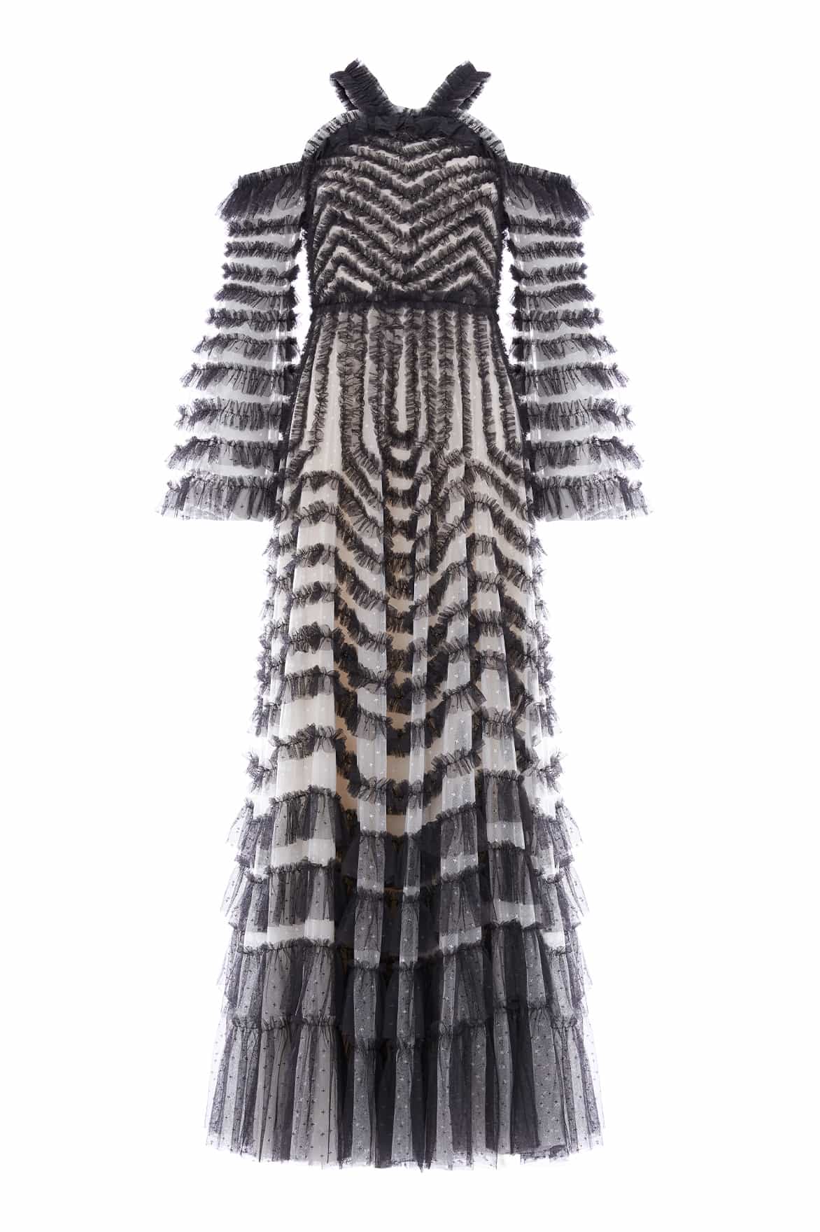 NEW SEASON | NEEDLE & THREAD EXCLUSIVE. The La Vie En Rose Off Shoulder Gown in Cream/Graphite. Designed with delicate ruffles cascading from the neckline down the panels, framed with contrast trims and gathered frills, the silhouette is soft and structured. A romantic and ethereal gown ideal for modern fairytale moments.