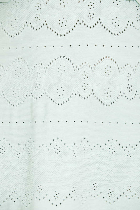 NEW SEASON. The Lace Knit Gown in Menthol Green. This knitted gown is developed from recycled viscose blend, with stretch yarn for a beautiful, flattering texture. Decorated with stitch pointelle details inspired by vintage woven lace ribbons. Crafted with a fitted stretch bodice, a feminine V-neckline and scalloped trim details for a romantic look. This easy-to-wear piece is the perfect wardrobe staple.