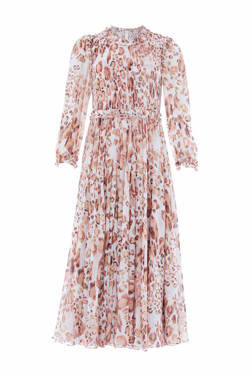 The Leopard Chiffon Smocked Ballerina Dress in Moonshine. This stunning piece features a hand-painted leopard print, created in-house using watercolour techniques. The soft, fluid motifs vary in scale, with a beautifully watery definition. Crafted from the softest chiffon, it boasts a shirred bodice that is delicately adorned with signature Needle & Thread frills at the neckline, shoulders, and waist. The blouson sleeves are gently gathered at the sleeve head and finished with ruffled cuffs for a romantic touch. The delicately gathered fluid skirt, fully lined for comfort, adds an elegant and graceful finish to this timeless design.