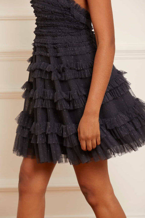 The Lisette Ruffle Halter Neck Micro Mini Dress in Graphite. A brand new shape for the season ahead. Crafted with an elegant halter neck and backless design. Beautifully engineered with signature Needle & Thread textile, delicate tulle panels and perfectly placed frills. Designed with a generous sweeping hemline made from layers of tulle and net to create a romantic silhouette. Make an entrance in this show-stopping dress.