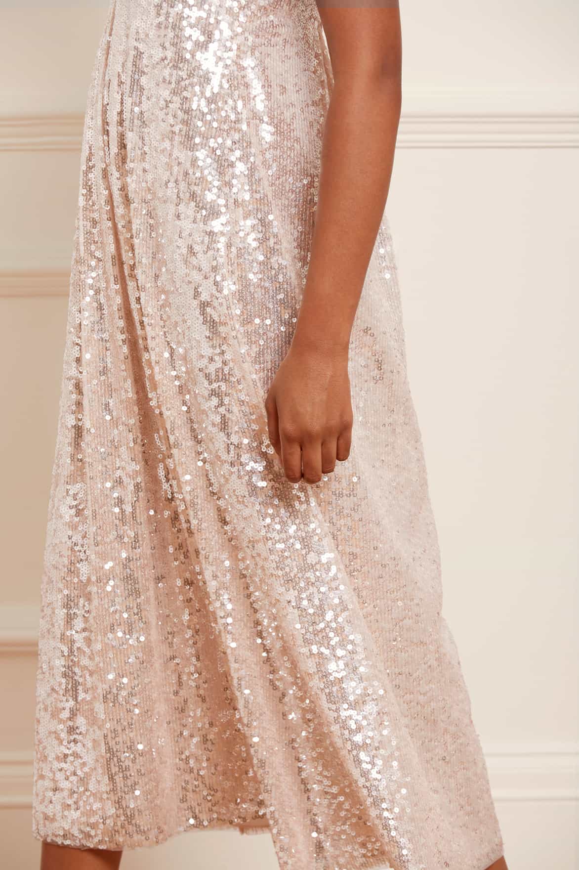 The Mila Gloss Ankle Gown in Cream. This magical piece is designed with specially sourced gloss sequins creating an extra sparkle effect. Developed with perfectly placed panels and pleats to create an effortlessly, flattering silhouette inspired by a 1930's tea dress. Make a striking appearance in the Mila.