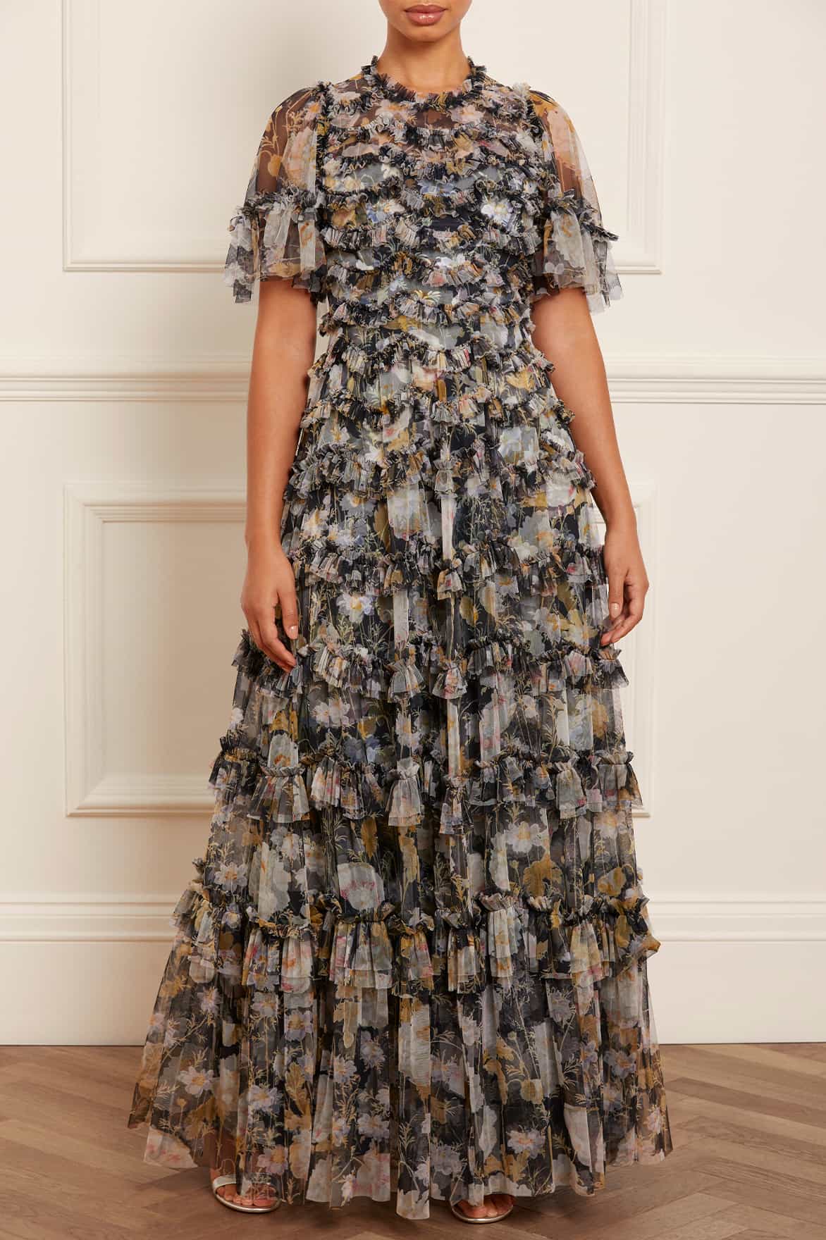 The Moonlight Petals Round Neck Gown in Graphite. The print of this gown is taken from a 1900's hand-painted artwork. Beautifully printed with soft white peonies and silvery blue wildflowers creating an enchanting print. Crafted with signature Needle & Thread detailing featuring delicate tulle frills, scallop shape borders and frills creating romantic texture throughout. You can dress the Moonlight up or down depending on the occasion.