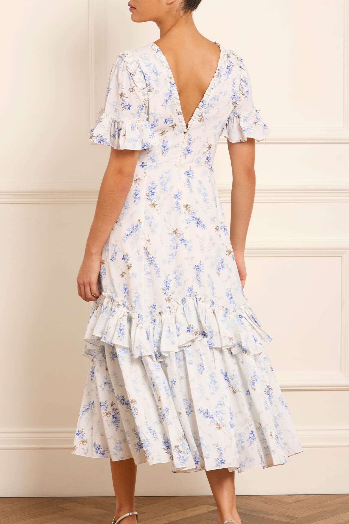 The Ophelia Ditsy Eva Crepe Ballerina Dress in Moonshine/Blue. This dress features a beautiful, romantic trailing print taken from an archive, hand-painted artwork from the early 1900s, depicting soft, whimsical ditsy floating florals. Inspired by 1930s tea dresses, it is adorned with elegant frills and offers an effortless, flattering fit with a V-shaped waist seam. The romantic fluted sleeves are detailed with frills, making this dress perfect for any occasion. The perfect piece to take you from day to night.