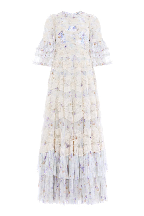 The Ophelia Ditsy Ingrid Gown in Moonshine/Blue. This beautiful, romantic trailing print was taken from an archive, and hand-painted artwork from the early 1900’s depicting soft whimsical ditsy, floating florals. This iconic Needle & Thread style is beautifully engineered with delicate tulle and subtle texture to capture this ribbon motif. A gown you'll forever treasure.