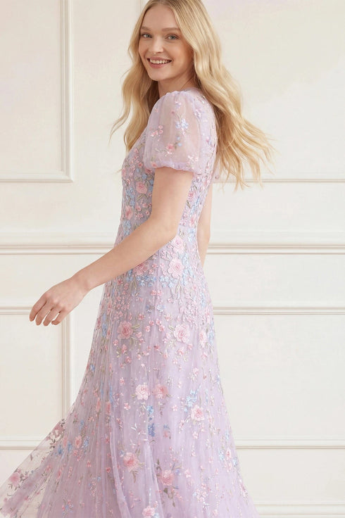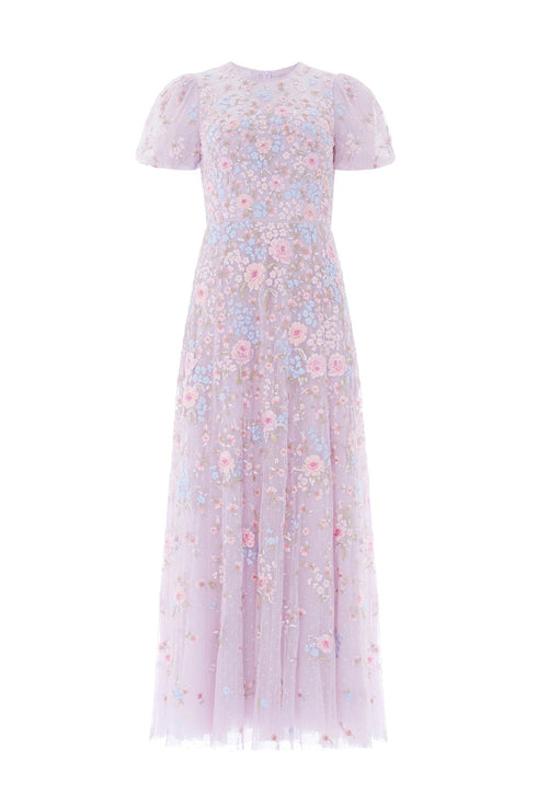 NEW SEASON. The Peony Bouquet Round Neck Ankle Gown in Powder Lilac/Multi. This romantic gown features intricate floral embroidery derived from early 1900s artwork, cascading gently towards the hem. Finished with a round neckline and flowing ankle-length skirt for timeless elegance.