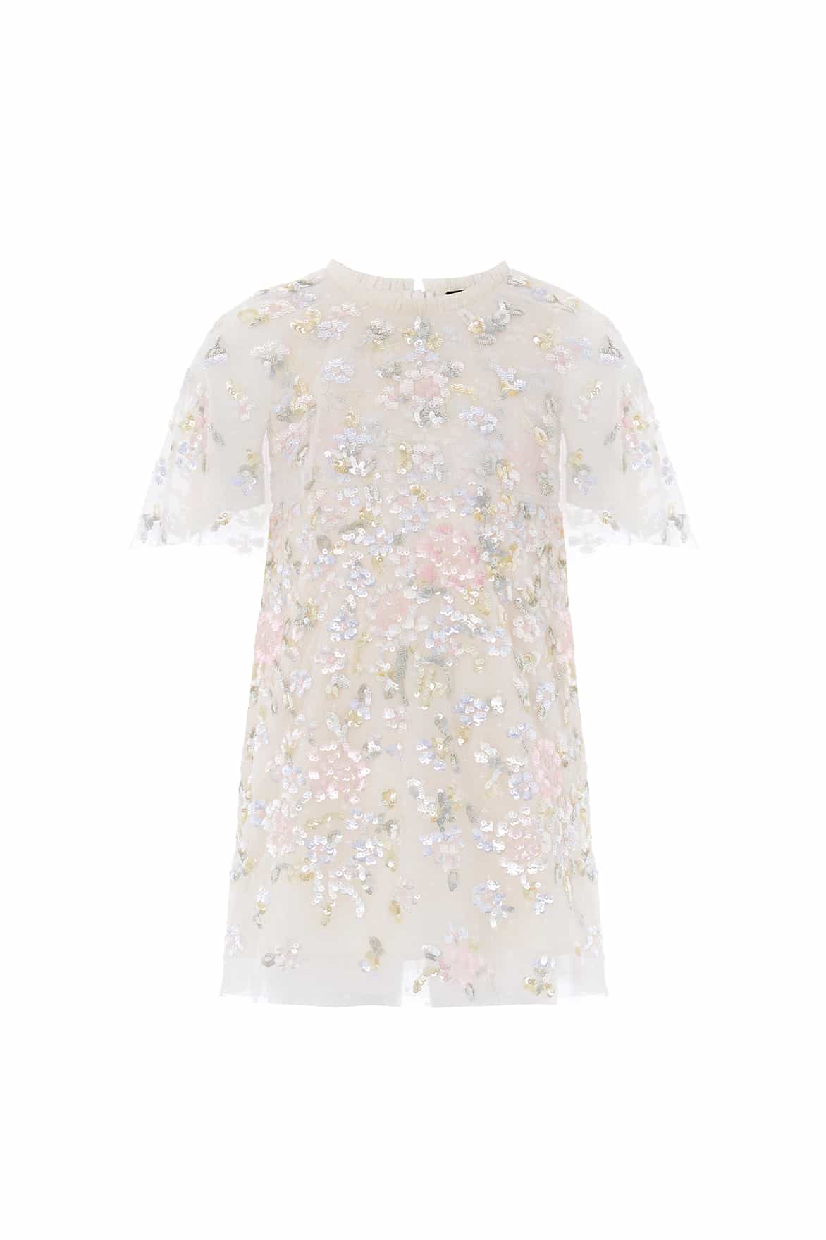 NEW SEASON. The Peony Bouquet Sequin Cape Kids Dress in Cream/Multi. This luxurious kids dress is adorned with tiny shimmering sequins forming romantic garden florals. Finished with a flowing cape detail and softly layered skirt, it creates a magical silhouette. A special occasion style with elegant sparkle.