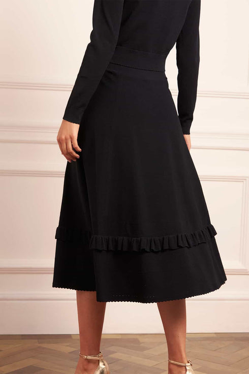 NEW SEASON. The Pointelle Trim Knit Skirt in Graphite. Cut in a slim silhouette with a gentle flare at the hem, this skirt showcases all-over pointelle stitching that creates airy texture and movement. In graphite, this versatile piece can be worn as part of a matching set with the cardigan or paired with evening separates for a polished look.
