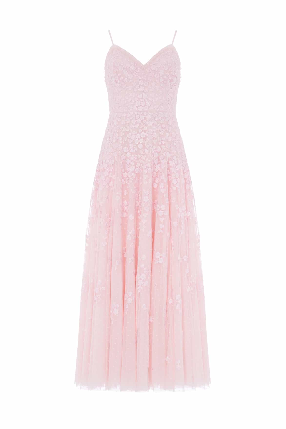 NEW SEASON. The Scatter Blossom Cami Ankle Gown in Seashell. Decorated with tonal embroidery of delicate ditsy florals. Crafted from airy tulle, this gown flows gracefully for a soft, romantic finish.