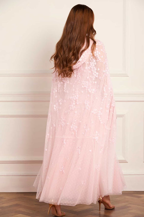 NEW SEASON | NEEDLE & THREAD EXCLUSIVE. The Scatter Blossom Hooded Long Cape in Seashell. A signature statement piece. Adorned with tonal floral embroidery and designed with a softly draped hood, this exclusive style adds ethereal charm to any look.