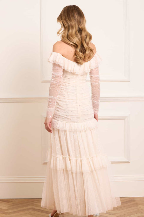 The Sequin Glimmer Rouched Off-Shoulder Gown in Cream. Make an entrance in this show stopping gown, featuring an off-shoulder neckline adorned with cascading circle-cut frills that create a soft, romantic silhouette. Crafted with glittering sequin dot motifs, enhanced with a high-shine foil coating for an ultra-lustrous finish, which gently scatters down the layered tulle skirt, adding ethereal movement. The ruched bodice and sleeves flatter the figure, while the tiered skirt with topstitched gathered frills lends delicate depth and charm. An internal stretch power mesh corset provides structure, comfort, and support, detailed with soft boning encased in grosgrain ribbon and adjustable hook-and-eye fastenings for a refined, couture finish.