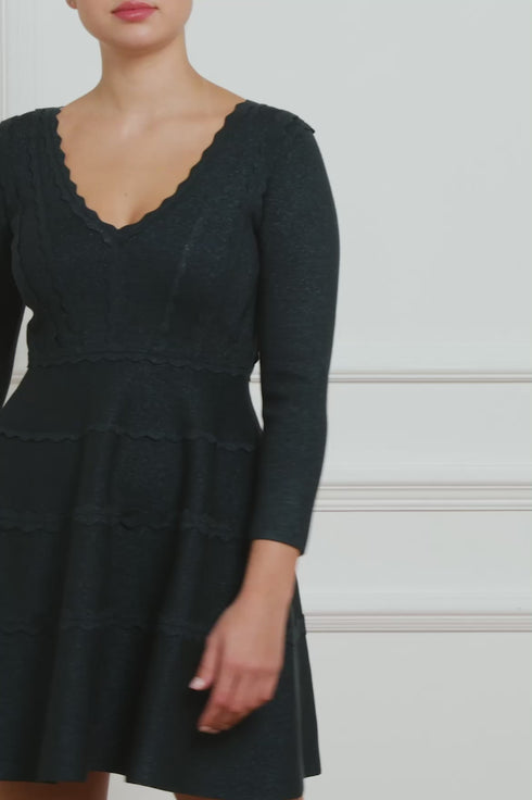 - Knitted stretch viscose dress with metallic fibre, decorated with scallop trims