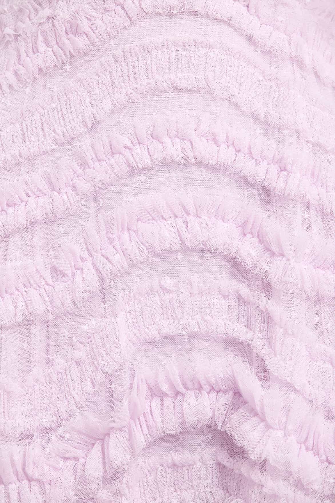 NEW SEASON. The Amara Round Neck Ruffle Gown in Powder Lilac. Inspired by romantic English gardens, this gown features softly curved ruffle bands flowing across the bodice for gentle movement and texture. Finished with a round neckline and a fluid full-length skirt, creating an elegant and timeless silhouette.