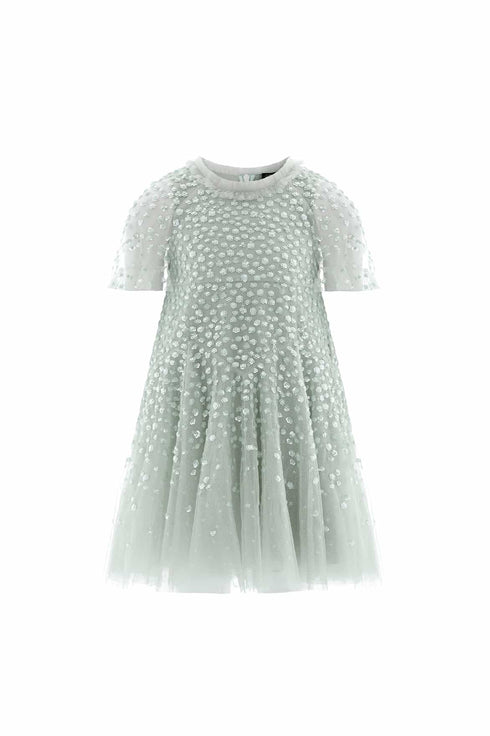 The Dappled Sequin Short Cape Kids Dress in Laurel. This dress sparkles with shimmering dot motifs that twinkle and dance toward the hem, creating a delightful glittering effect. The playful cape with a frilly edge adds a touch of fairytale magic, while the chevron seaming on the skirt ensures a flattering, pretty fit. The voluminous tulle skirt, with its soft, layered fullness, sways beautifully—perfect for endless twirls and making every moment feel like a dream come true.