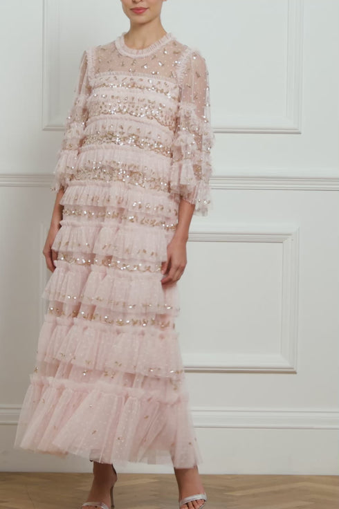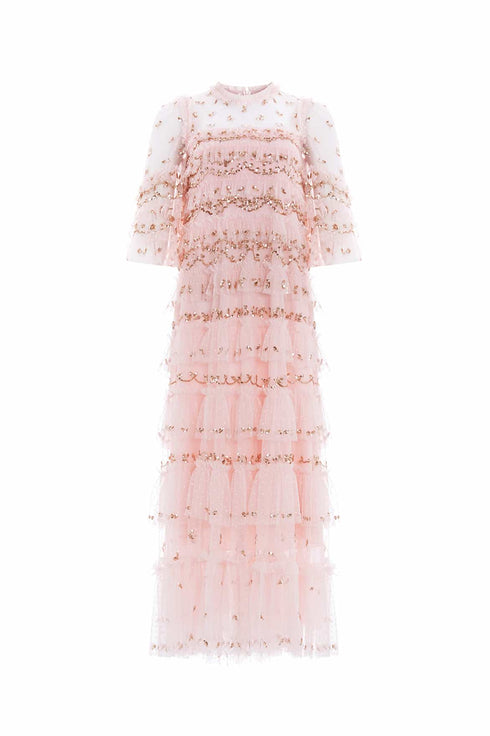 The Emily Lace Ankle Gown in Dusk Pink/Caramel. This ethereal gown is adorned with delicate sequin embellishments, arranged in intricate border designs that capture the essence of vintage romance. Developed with signature Needle & Thread tulle frills cascade down the gown, gradually increasing in size as they reach the hem, each one adorned with glittering sequins for a captivating sparkle. Crafted with romantic fluted sleeves, featuring a delicate leaf motif and frills at the cuff, adding a touch of charm to this timeless piece. Designed for elegance and comfort, the gown boasts a loose-fit silhouette with perfectly proportioned gathered tiers, offering a flattering and effortless wear. Whether for a special occasion or a moment that calls for something truly unique, the Emily Lace Ankle Gown is a breathtaking choice that combines vintage inspiration with contemporary luxury.