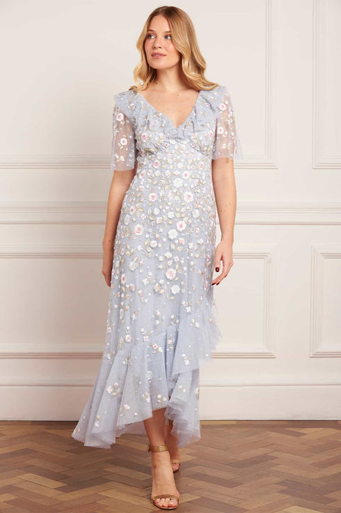 NEW SEASON. The Ethereal Blooms Frill Ankle Gown in Skylight/Multi. A romantic tulle design featuring exquisite floral embroidery interspersed with subtle sequin motifs. Finished with delicate frill detailing and soft pastel tones, this gown exudes lightness and refined grace.