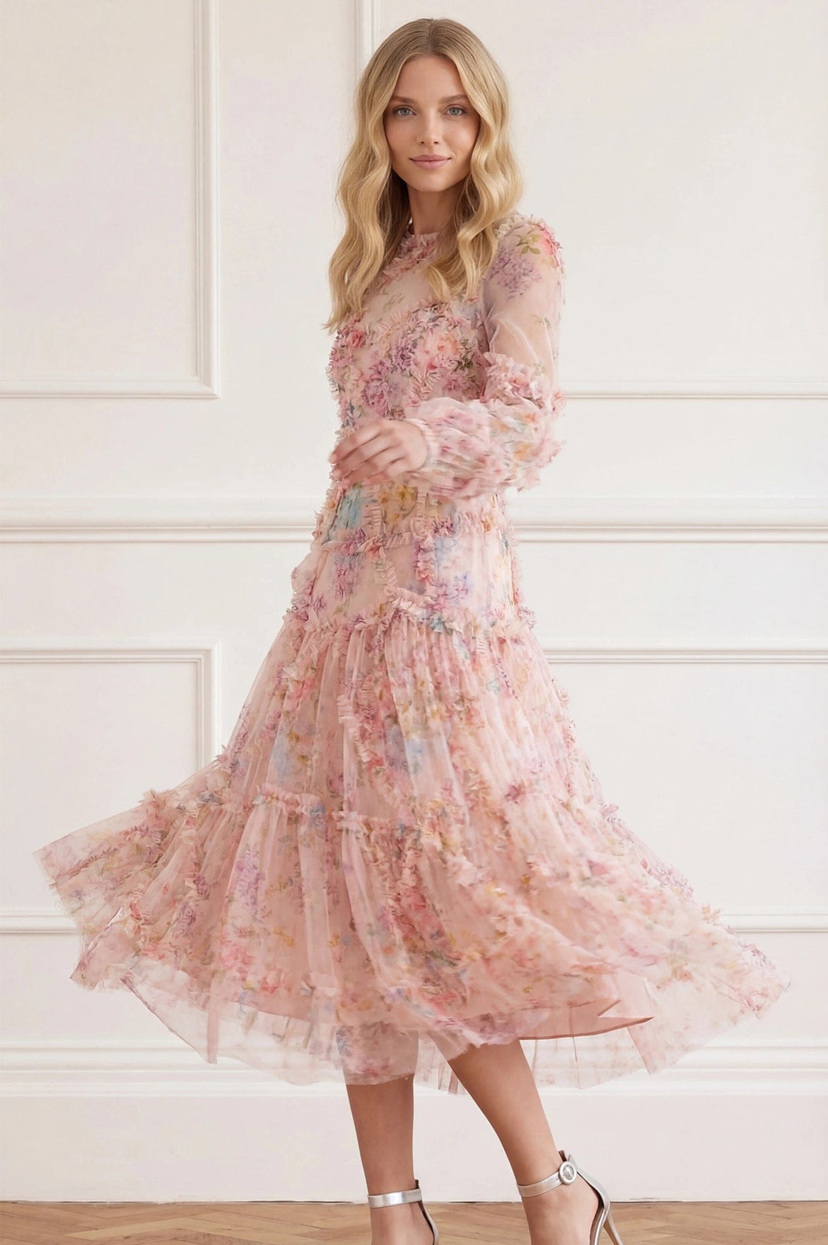 Floral Diamond Ruffle Ballerina Dress in Topaz Pink. This eye-catching piece is crafted from delicate ruffled tulle with an all-over vintage print taken from an early 1900's hand-painted fabric design. A romantic look featuring voluminous cuffed sleeves and a flattering skirt that skims the body to gently increase in fullness, creating stunning movement within the tulle. This Victorian-inspired look with a contemporary edge will be the star of your wardrobe.