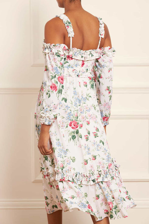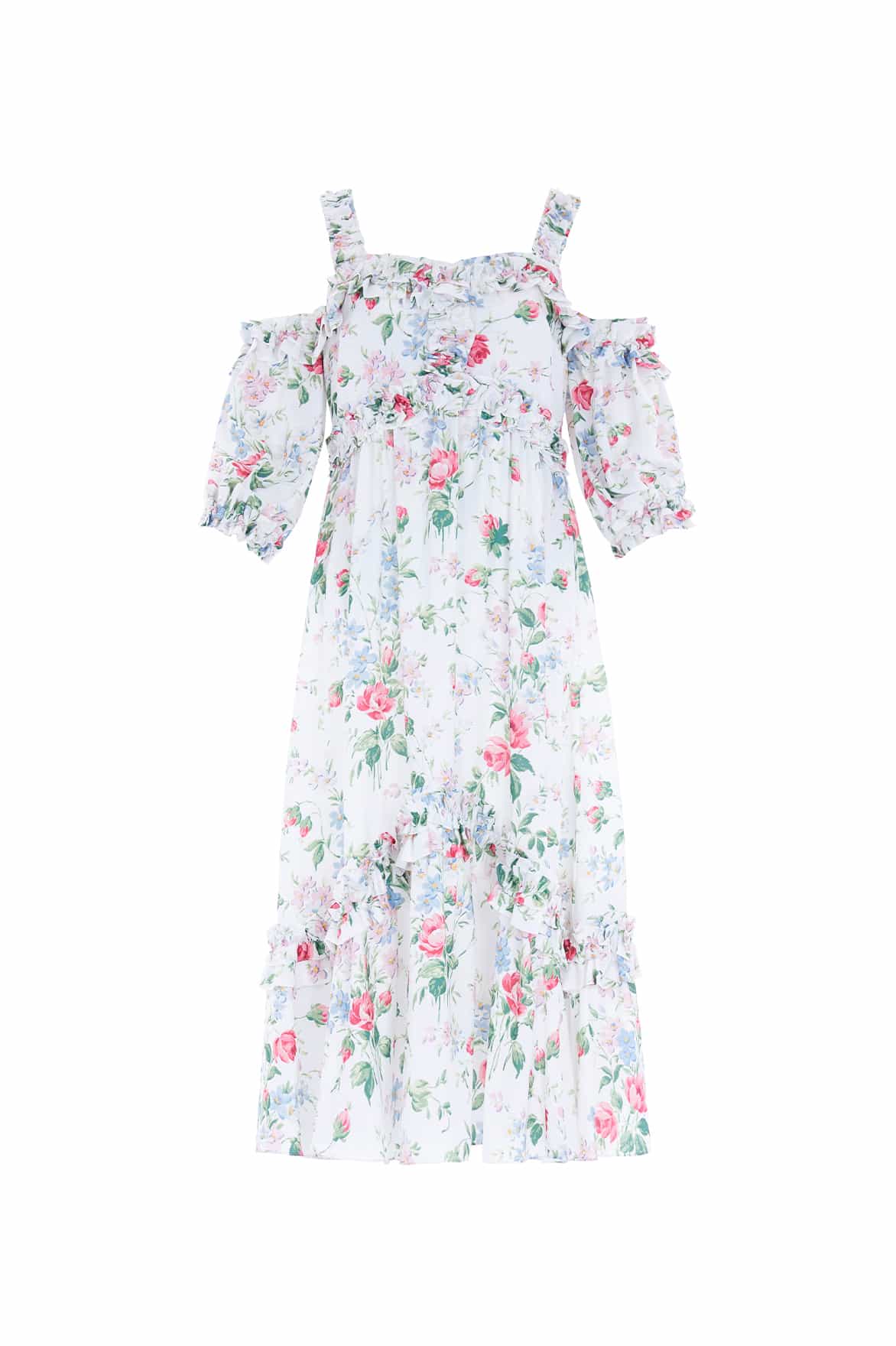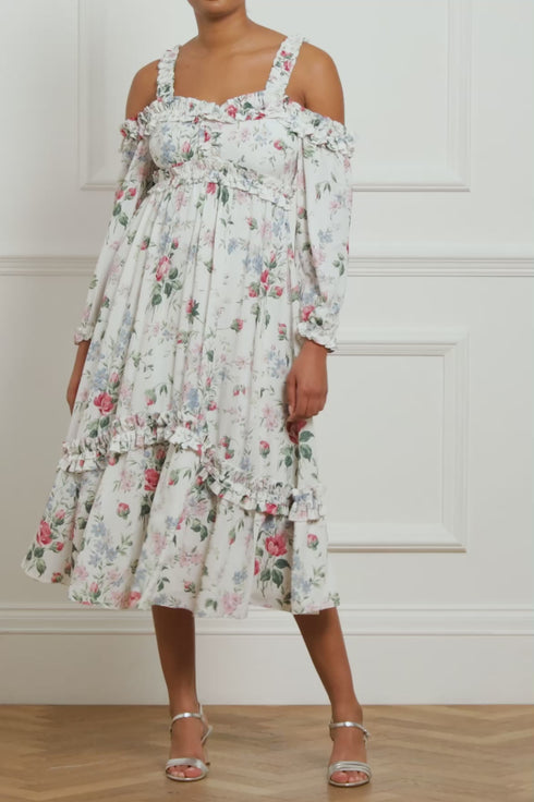 The Floral Fantasy Crepe Off-Shoulder Ballerina Dress in Moonshine. Designed with a beautiful floral print taken from an early 1900’s hand-painted wallpaper design. Decorated with romantic garden florals that create an all-over, organic layout in a whimsical flower artwork. Designed with a contemporary cold-shoulder detail and signature frills adorning the sleeves and bodice adding a romantic edge. Crafted with a loose-fit silhouette for an effortless, whimsical look. A transitional day to night piece.