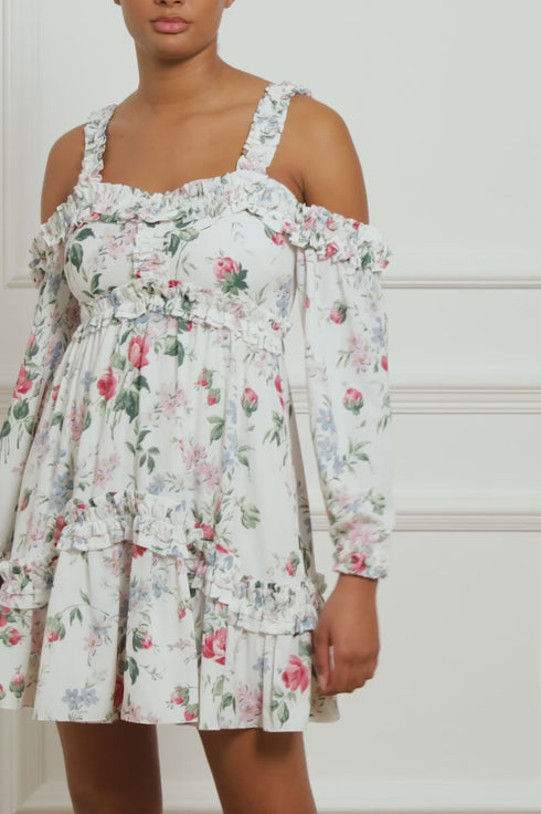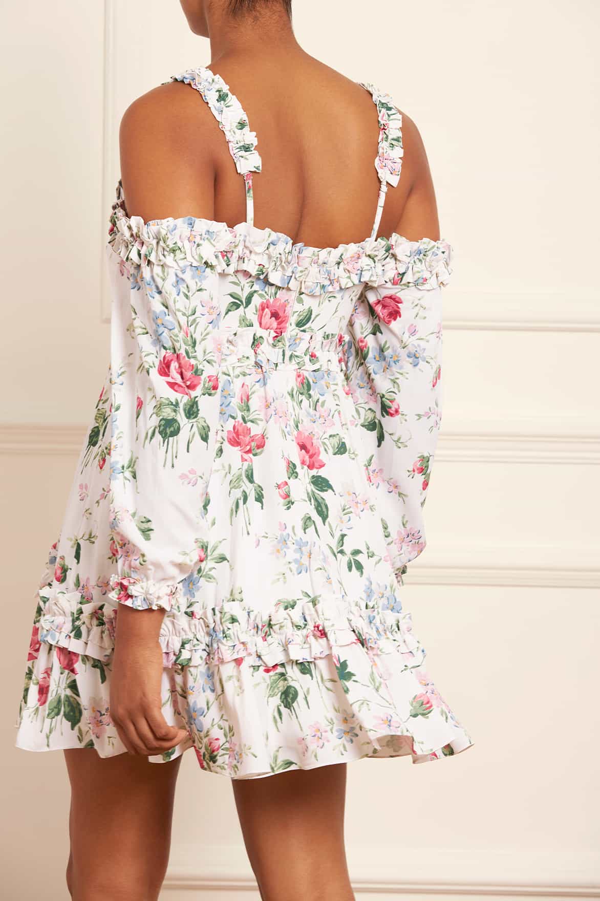 The Floral Fantasy Crepe Off-Shoulder Micro Mini Dress in Moonshine. Designed with a beautiful floral print taken from an early 1900’s hand-painted wallpaper design. Decorated with romantic garden florals that create an all-over, organic layout in a whimsical flower artwork. Designed with a contemporary cold-shoulder detail and signature frills adorning the sleeves and bodice adding a romantic edge. Crafted with a loose-fit silhouette for an effortless, whimsical look. A transitional day to night piece.