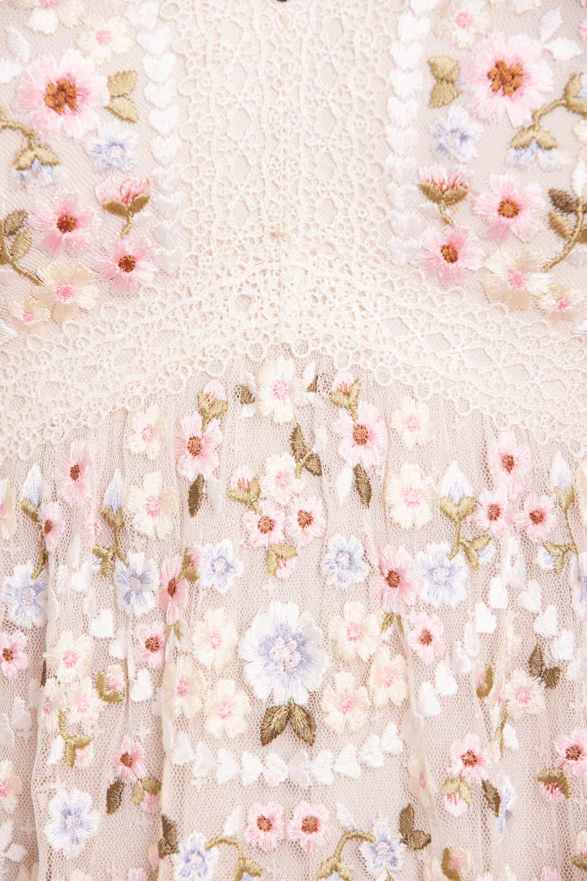 The Garland Ribbon Ankle Gown in Cream This embroidered gown is inspired by Victorian lace trims. Beautifully designed with floral embroidery in soft pastel tones. Developed with a V-shaped waist seam to create a flattering, effortless fit. This gown is adorned with intricate lace trims for signature Needle & Thread detailing. A pretty piece you'll forever treasure.