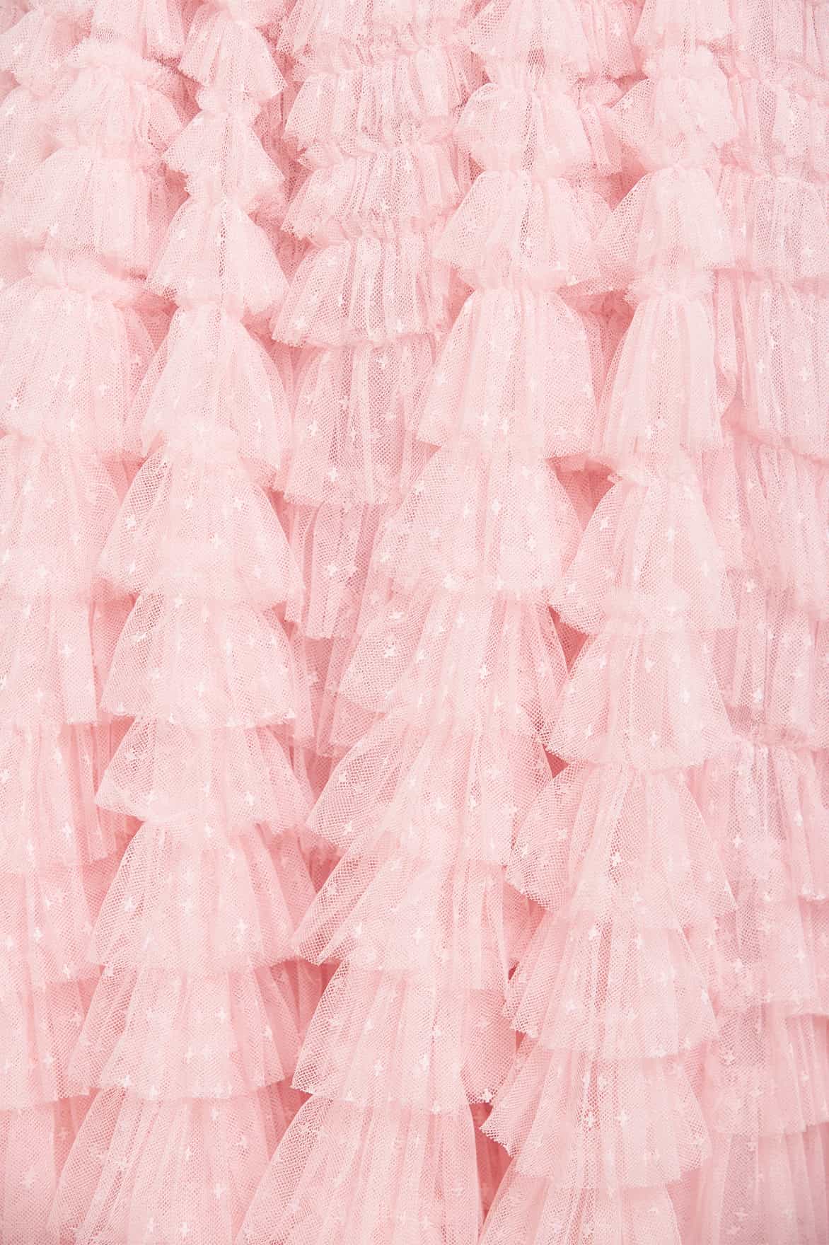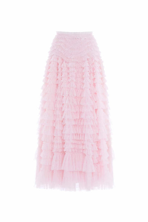 The Hattie Ruffle Skirt in Peony Pink. This textile skirt is engineered with layers of soft tulle and net to create a signature Needle & Thread style. Crafted with individual ruffles to create a beautiful, frilly texture. Designed with a sweeping hemline and finished at the waist with a satin ribbon for extra detail. We recommend pairing this skirt with our knitwear for a romantic Needle & Thread look.