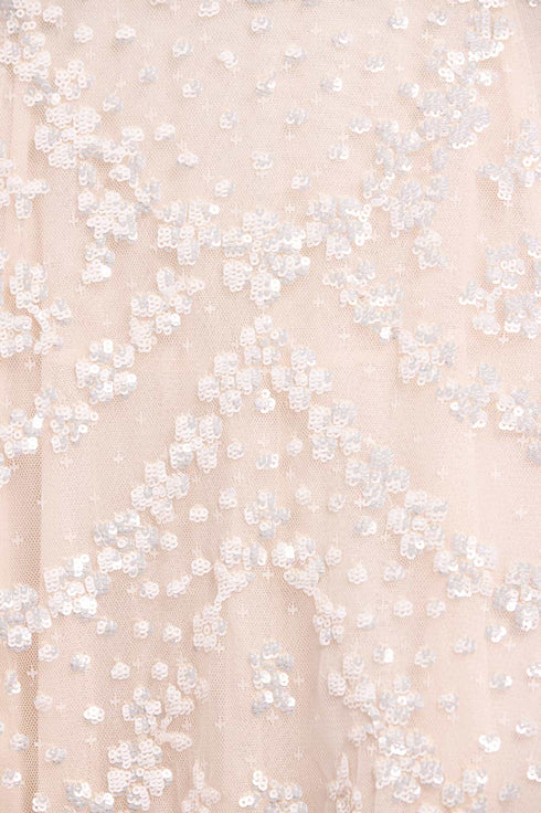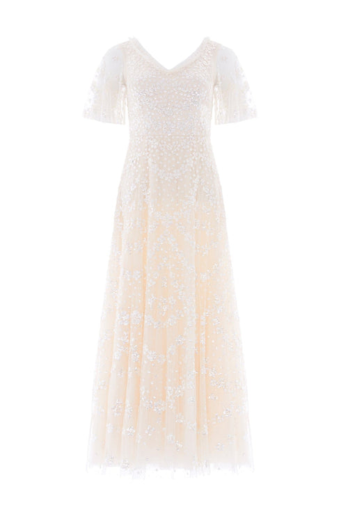 NEW SEASON. The Isobel Sequin Ankle Gown in Cream. Inspired by vintage lace designs, this ankle-length gown features delicate floral sequin motifs arranged in soft scalloped formations. The embellishment gradually becomes lighter towards the hem for a romantic, flattering finish.