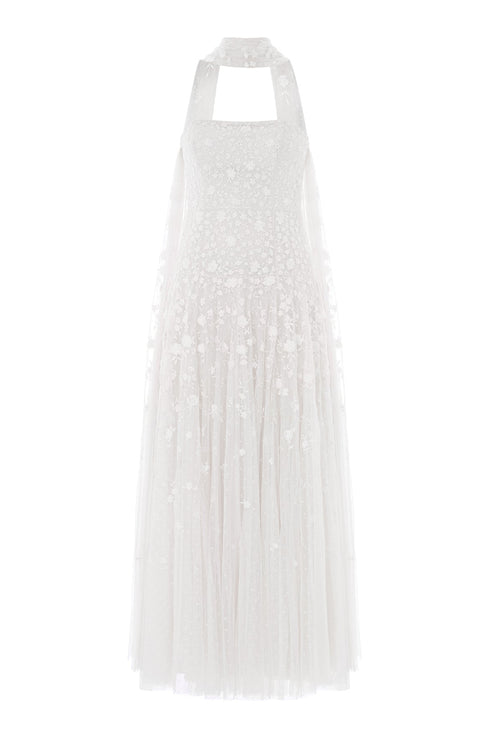 NEW SEASON. The Lea Ditsy Strapless Cape Gown in Swan White/Cream. Adorned with romantic ditsy florals inspired by wild garden blooms, this gown features a strapless cape silhouette with separate scarf. The flowing skirt creates soft movement for a dramatic yet refined occasionwear look.