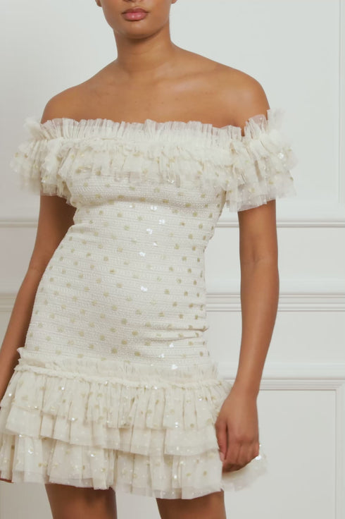 The Polka Dot Smocked Micro Mini Dress in Cream / Gold. A brand new statement style for the season ahead. Developed beautifully with signature, frothy tulle in fully stretch fabric for a fitted design. This dress is scattered with polka dot motifs in shimmer sequins to create a glistening effect. Adorned with a elasticated smocking body falling into a layered frothy tulle skirt for a playful, contemporary look. This dress features an off-shoulder design using elasticated layers of tulle to create comfort and signature Needle & Thread styling. We hope you adore this dress as much as we do.