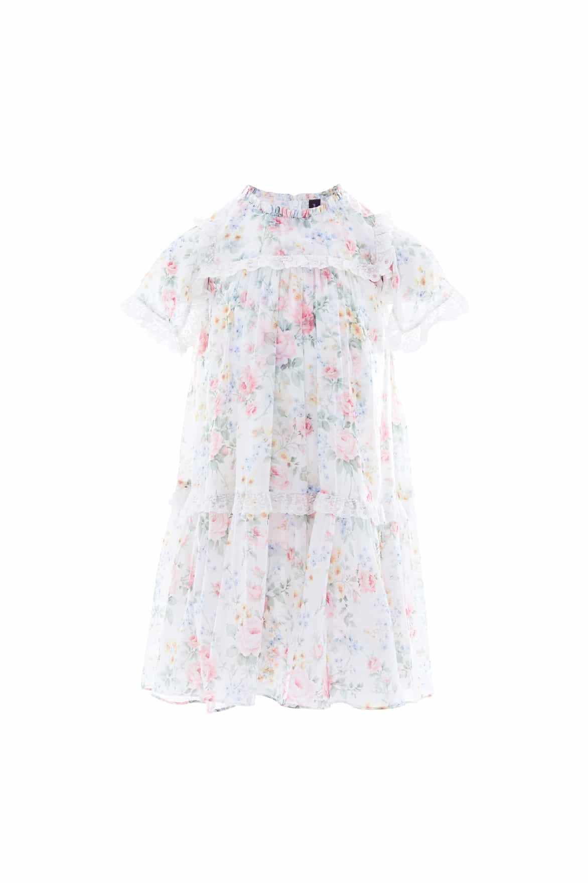 The Pompadour Garden Chiffon Lace Kids Dress in Moonshine. This dress features hand-painted floral bouquets and trailing ditsy motifs, inspired by the Palace of Versailles. Designed with delicate lace-edged handkerchief sleeves and a loose, comfortable fit adds vintage charm. Crafed with signature Needle & Thread frills at the neckline and a softly gathered, lace-edged skirt creates a perfect twirl-ready look.