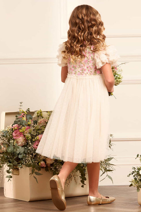 NEW SEASON. The Posy Bodice Kids Dress in Cream/Pink features a 1930s-inspired print with posies and vintage embroidery. Crafted in soft tulle with a relaxed trapeze silhouette and a smocked yoke panel, this easy-to-wear style is a new season favourite. Perfect for any upcoming special occasion.