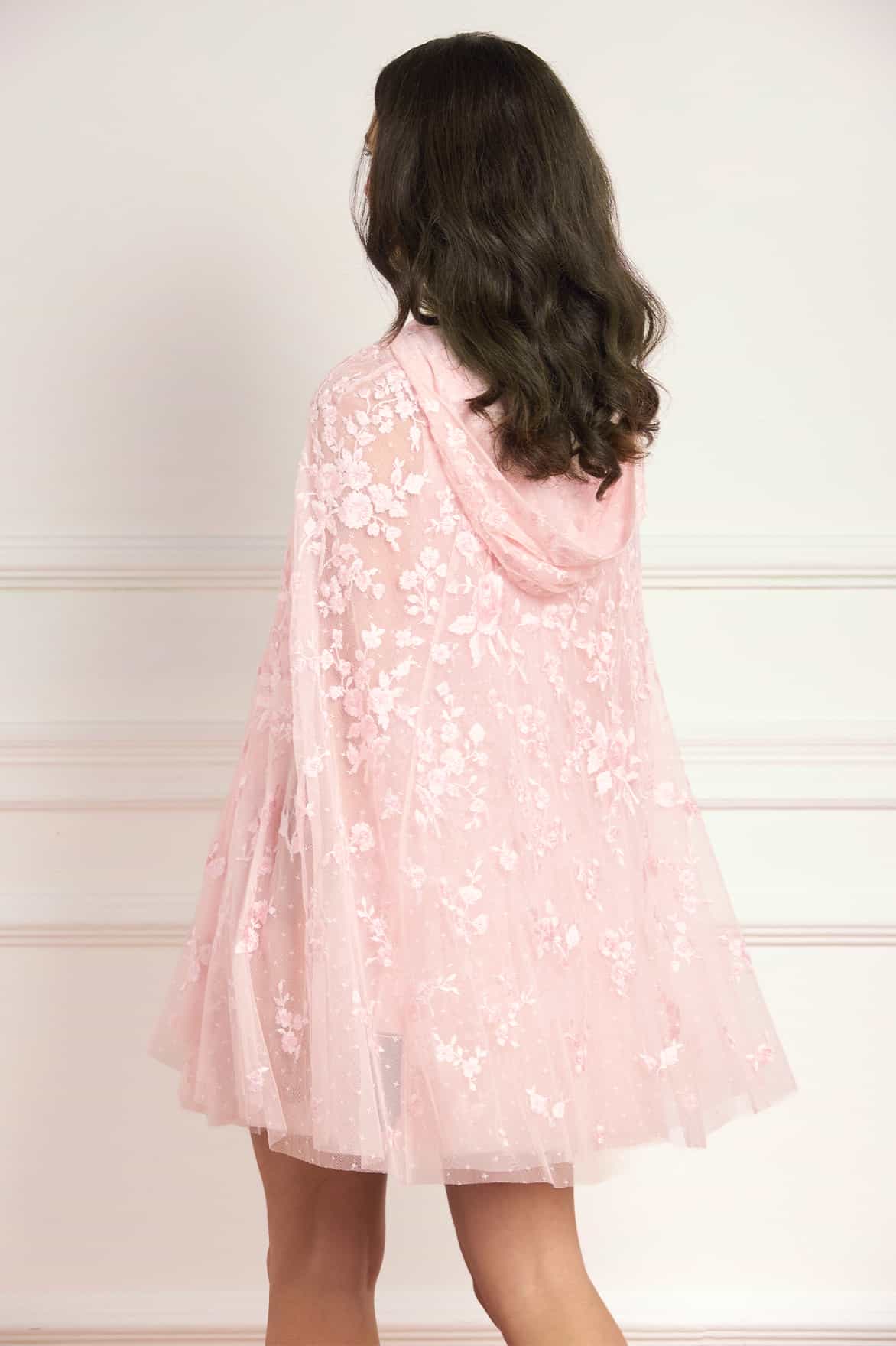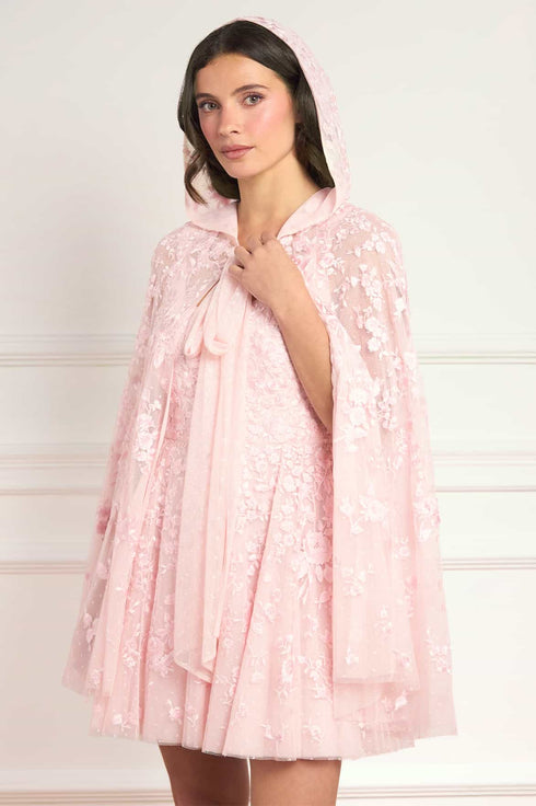 NEW SEASON | NEEDLE & THREAD EXCLUSIVE. The Rosa Hooded Cape in Peony Pink. Inspired by signature floral embroidery, the Rosa Hooded Cape offers a romantic layering piece with an ethereal feel. Designed with soft drape and delicate detailing, it adds a dramatic yet refined finish to occasionwear looks.