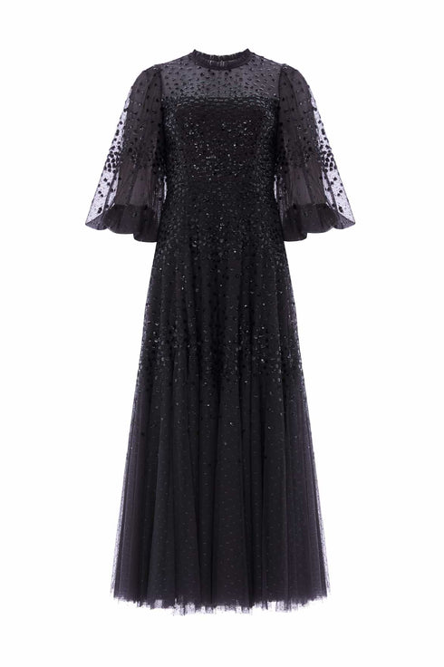 NEW SEASON. The Scallop Sequin Round Neck Ankle Gown in Graphite. A moody take on timeless romance. Featuring scallop-shaped sequin clusters across a slim bodice and ankle-grazing skirt, the gown balances subtle shine with architectural detail. The graphite base enhances its modern sophistication, making it a gown for elegant soirées.