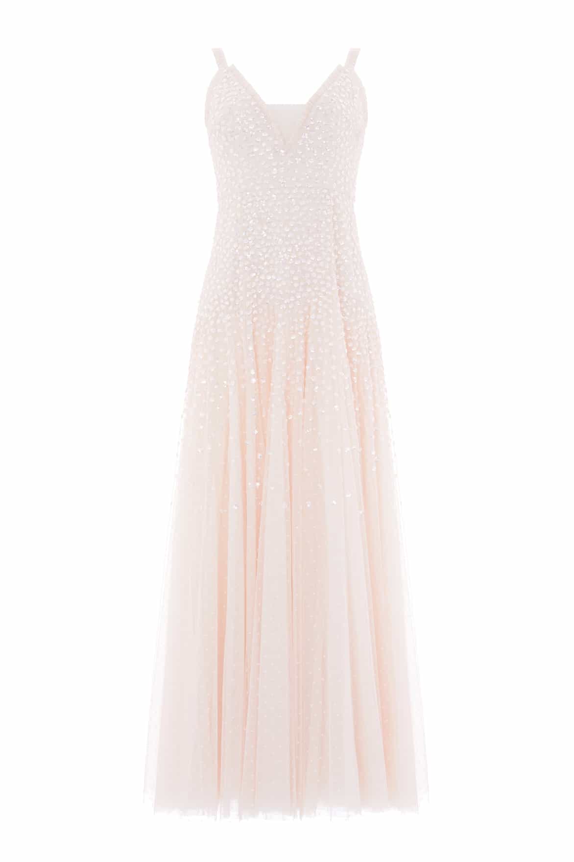 The Sequin Cascade Cami Plunge Gown in Opal/Cream. This beautiful dress features shimmering embellishment in contrast cream tones. The deep V neckline and layered tulle skirt create a flowing silhouette, while the sequins scatter across the surface for an iridescent effect. A captivating piece for unforgettable looks.