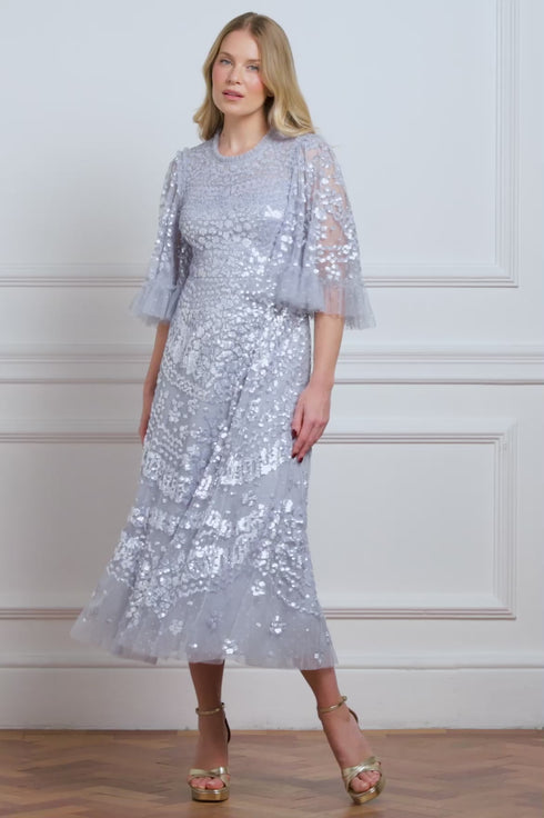 NEW SEASON | NEEDLE & THREAD EXCLUSIVE. The Anais Sequin Ballerina Dress in Skylight. A romantic statement piece adorned with shimmering sequin artwork inspired by vintage French lace. Crafted from soft tulle, this style features delicate fluted sleeves and gentle frill detailing, creating graceful movement with every step.