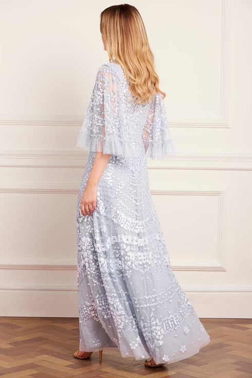 NEW SEASON. The Anais Sequin Gown in Skylight. A luminous statement piece inspired by vintage French lace. Crafted from soft tulle and adorned with shimmering sequins in a delicate border design, this gown features romantic circle-cut frills and fluttering sleeves for graceful movement and timeless allure.