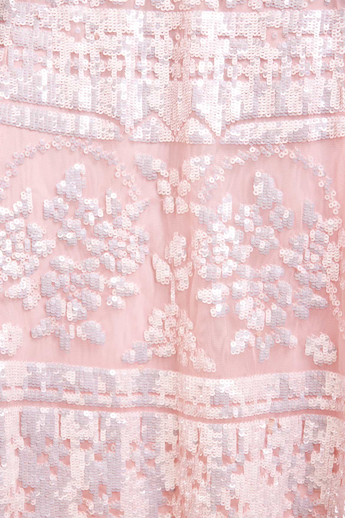 The Aurora Gown in Dusk Pink/Cream. A signature Needle & Thread style from the archive, this timeless gown draws inspiration from antique tablecloths of the early 1900s. Intricately crafted with a shimmering placement border of sequins, it celebrates the art of vintage craftsmanship. The elegant silhouette features a round neckline, slim long sleeves, and delicate tulle frills at the neckline and armholes—a hallmark of the brand. Finished with layers of soft, romantic tulle, this heritage piece captures classic beauty with a modern edge.