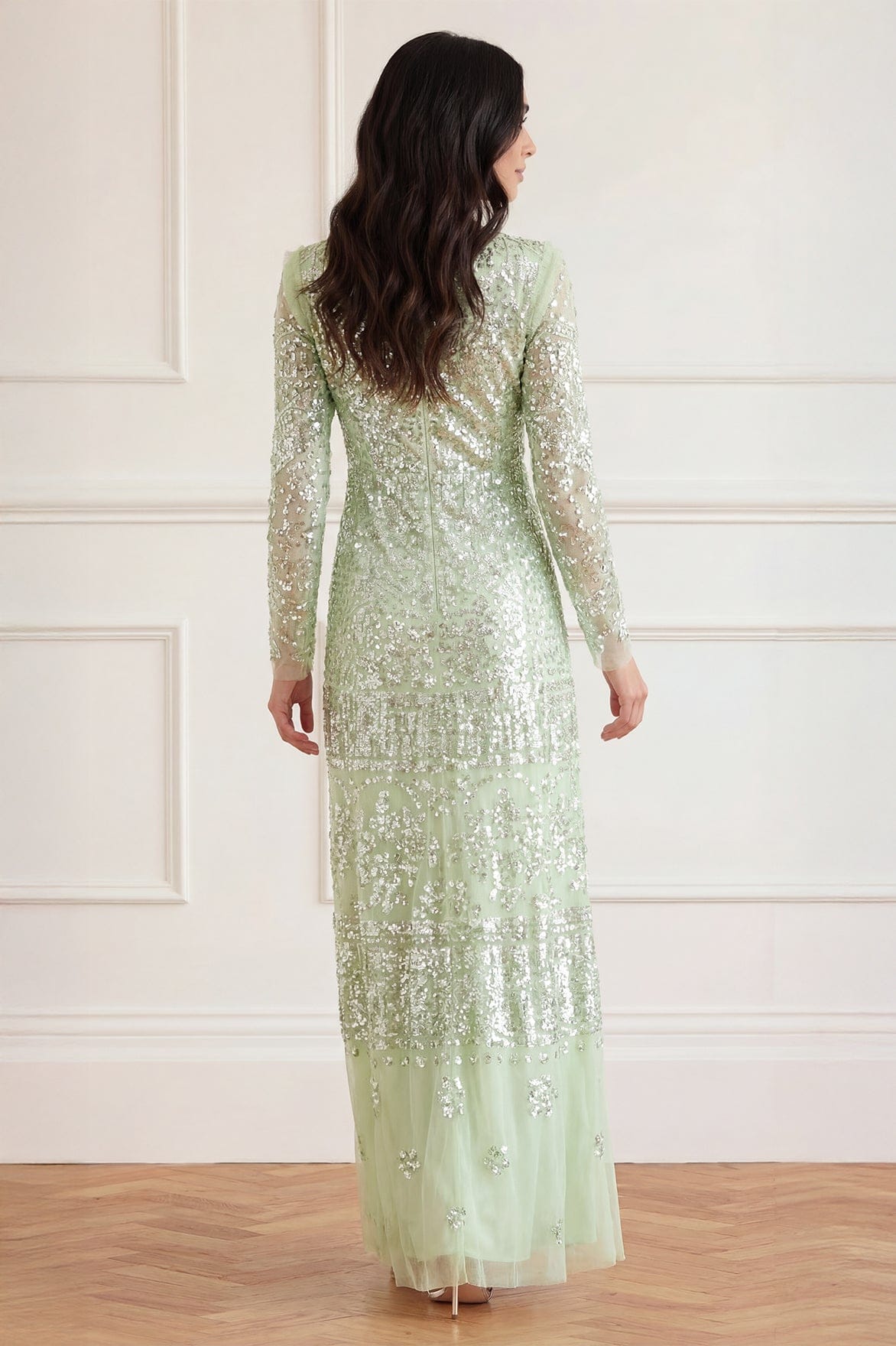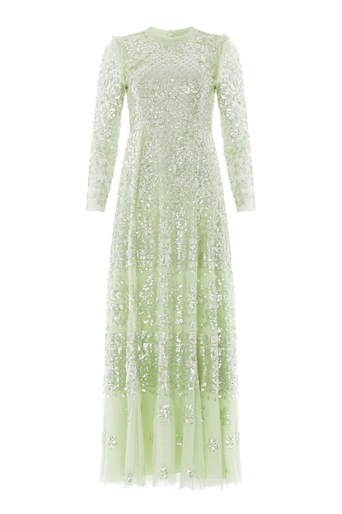 NEW SEASON. The Aurora Gown in Peppermint. Designed with delicate detailing inspired by romantic English florals, creating a soft, ethereal finish. The flowing full-length silhouette moves beautifully, making it an elegant choice for occasionwear.