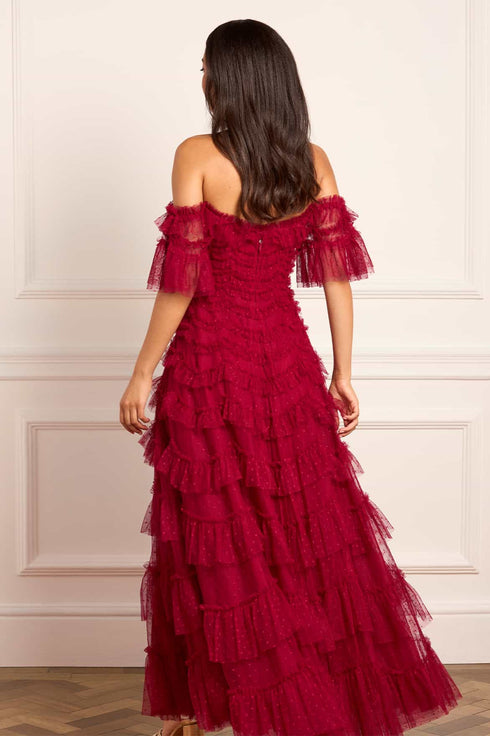 NEW SEASON. The Aviana Off-Shoulder Gown in Red. Romantic dressing is reinvented with a dramatic palette. Crafted from sculptural rows of soft tulle frills, this statement gown features scallop-tiered layers that build volume and romance. The rich red shade amplifies the gown’s drama, evoking passion and intensity.