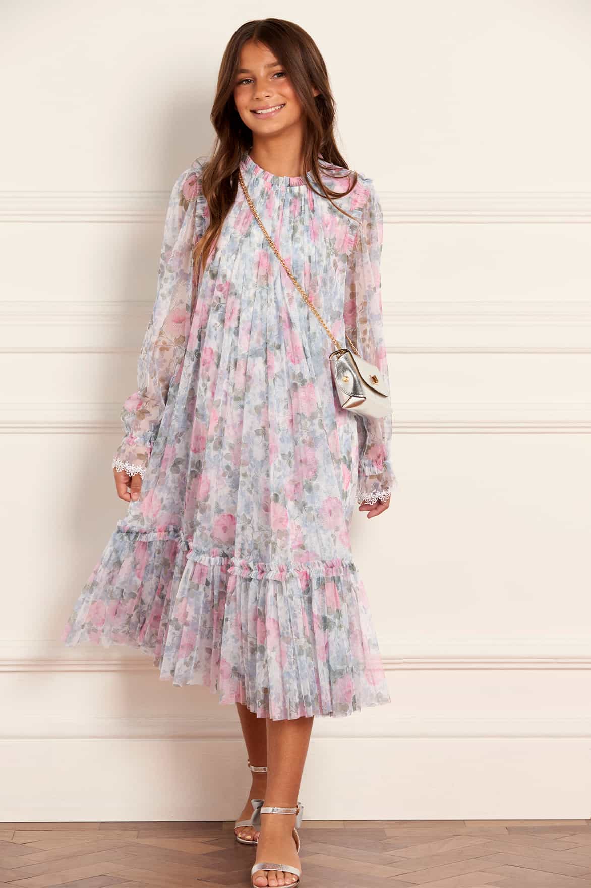 NEW SEASON. The Camille’s Garden Long Sleeve Kids Dress in Moonshine. Features the collection’s signature floral print. Crafted with a gathered waist and floaty sleeves, it’s a sweet, versatile piece for both family occasions and festive moments.