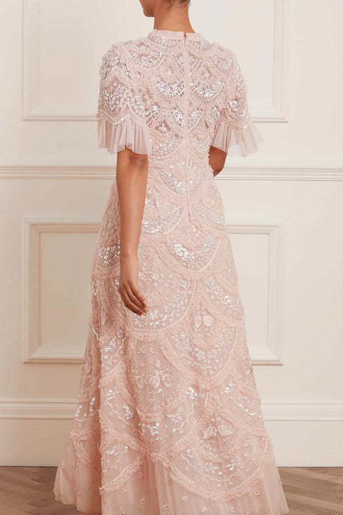 The Carmen Ruffle Ankle Gown in Petal Pink. Where romance meets elegance, the Needle & Thread Carmen Ruffle Ankle Gown is crafted from layers of soft tulle, adorned with exquisite embroidery, and sparkling iridescent sequins to create a beautiful silhouette. Each of the carefully crafted detail evokes the sense of timeless beauty. Layers of tulle give a soft shimmer to gentle ruffles in scalloped sections to create a signature Needle & Thread textured look.