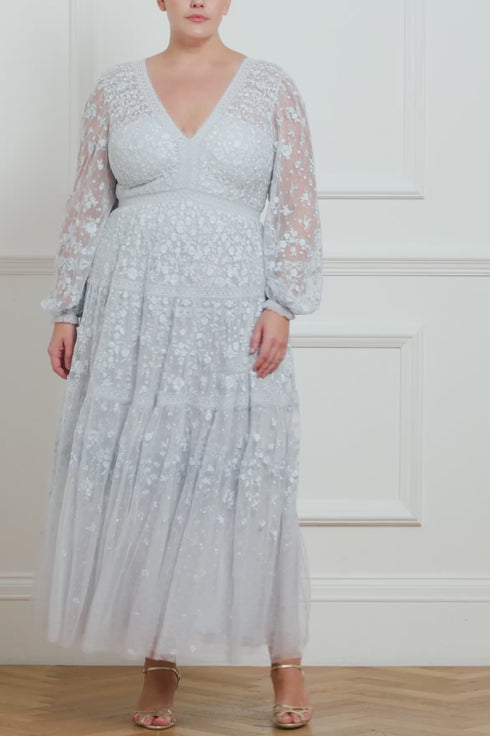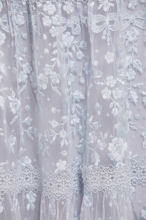 The Celestia Ribbon Gown in Blue. This gown has been intricately designed with rich embroidery inspired by vintage lace, featuring delicate floral motifs and ribbon bows throughout. Crafted with pretty lace trims for signature Needle & Thread detailing, and delicately constructed with a textured tulle fabric base. Featuring a V-shaped neckline and a new, ultra-flattering silhouette. Make the ultimate statement in the Celestia.
