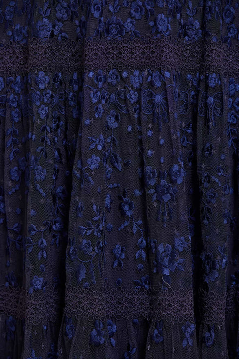 The Celestia Ribbon Ankle Gown in Navy. This gown has been intricately designed with rich embroidery inspired by vintage lace, featuring delicate floral motifs and ribbon bows throughout. Crafted with pretty lace trims for signature Needle & Thread detailing, and delicately constructed with a textured tulle fabric base. Featuring a V-shaped neckline and a new, ultra-flattering silhouette. Make the ultimate statement in the Celestia.