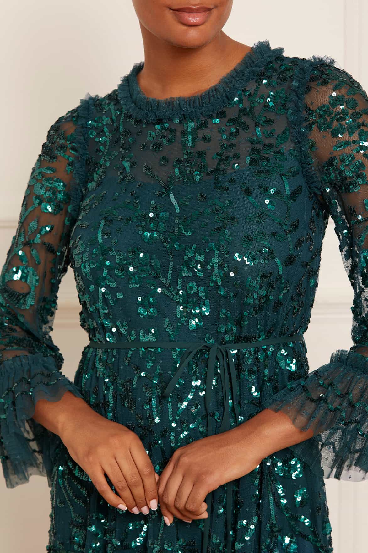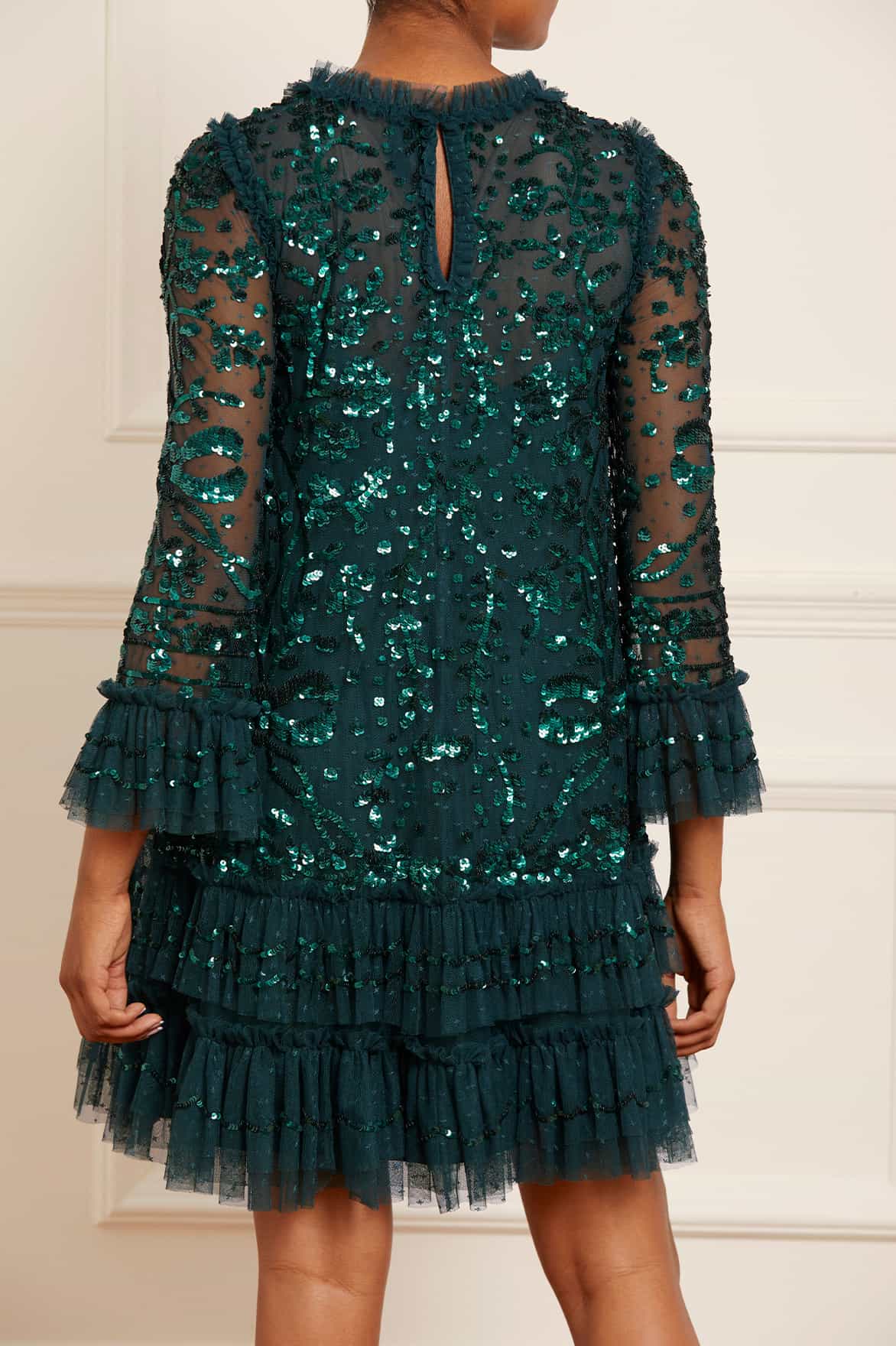 The Celia Long Sleeve Mini Dress in Emerald. This statement long sleeve dress is designed with romantic artwork featuring ornate florals and ribbon bows, densely embellished with shimmering sequins for exquisite detailing. Designed with an effortless loose fit with soft, playful tulle frills on the hem and cuffs. A key piece in our collection.