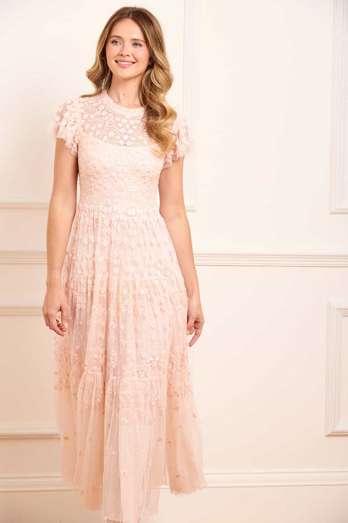 The Clover Short Sleeve Ankle Gown in Opal. A softly romantic piece inspired by vintage lacework. Featuring intricate embroidery in floral and scalloped patterns, the artwork fades into whimsical swirls as it reaches the hem. Finished with short sleeves and layered tulle, this gown is perfect for elegant celebrations and feminine dressing.